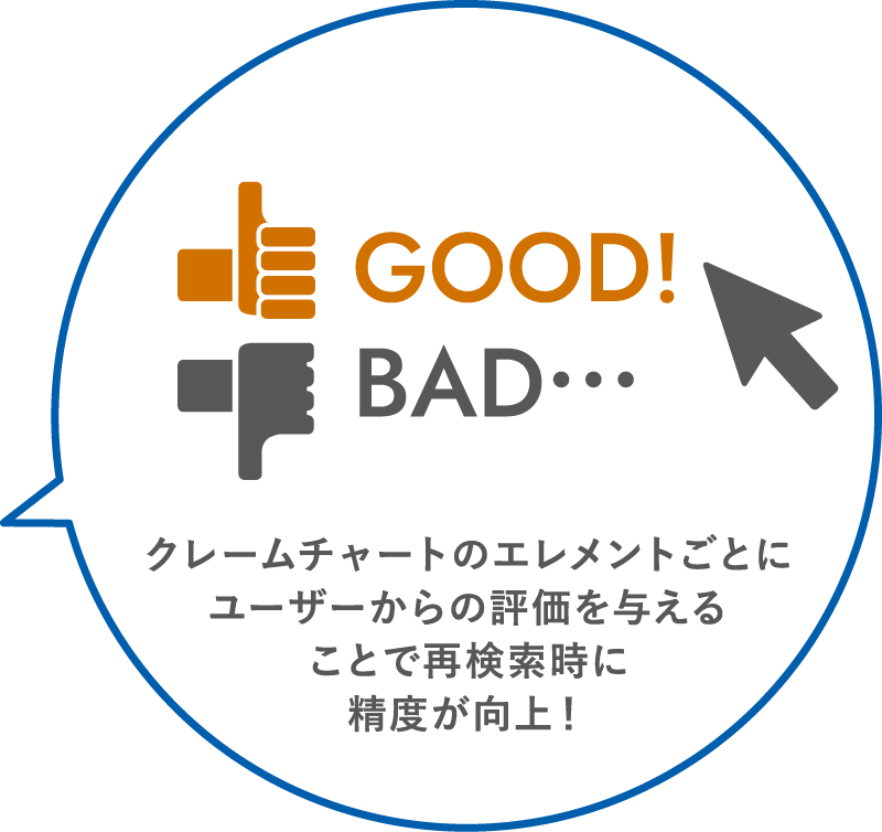 先⾏技術調査と無効資料調査において、AIが出⼒したクレームチャートに、ユーザーの評価を与える機能があります。ユーザー評価を⾏うことで、再検索時に評価を反映するので検索を繰り返すほどに精度が向上します。評価内容は定期的に集約してアルゴリズムの更新に活⽤するため、従来の検索システムにはない⾼精度な⽂章検索を実現します。