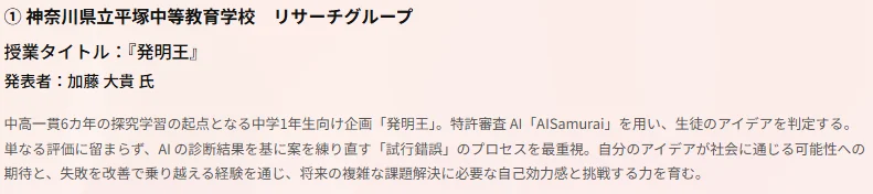 本授業では、特許審査シミュレーションシステム「AI Samurai」を活用し、生徒のアイデアを判定・分析しながら、試行錯誤を繰り返すプロセスを重視しています。AIによる評価結果をもとに改善を重ねることで、生徒が自らのアイデアの可能性を認識し、失敗を乗り越えながら挑戦する経験を積む点が評価されました。