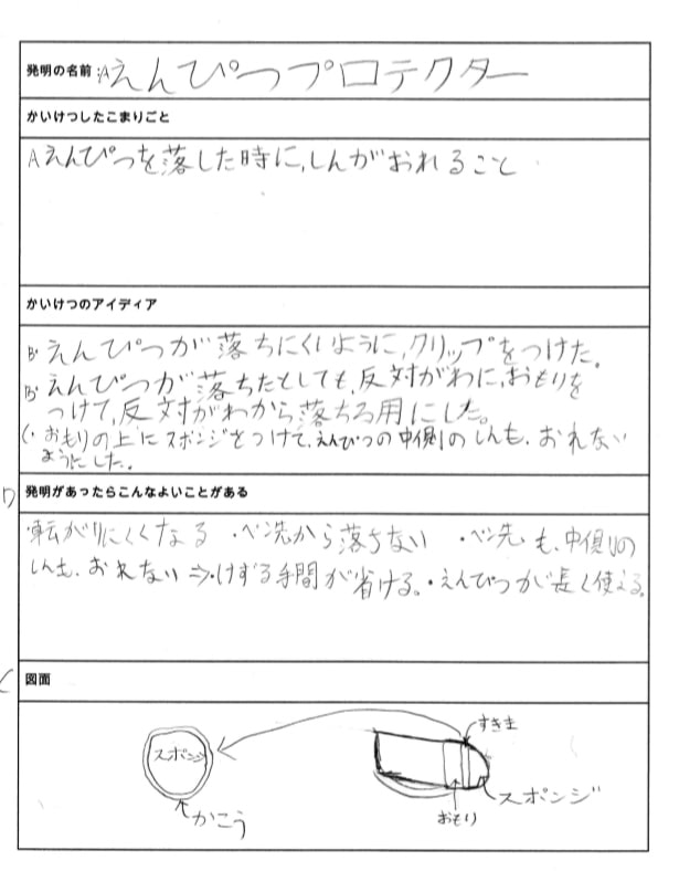『えんぴつプロテクター』を発明してくれたみみ子ちゃん&真心ちゃんに話を聞いてみたでござる。二人が見つけた困りごとは「えんぴつを(机の上から)落した時に芯が折れること」。これを改善するための発明を考えてくれたでござるよ!