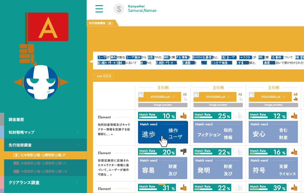 AI Samuraiは、AIが自動で特許調査を行い特許性を評価するAI搭載型クラウドWebアプリケーションです。知財業務のデジタルシフトを加速するために、使いやすいUIデザインと最先端の自然言語処理分野のAI技術を用いて開発されました。