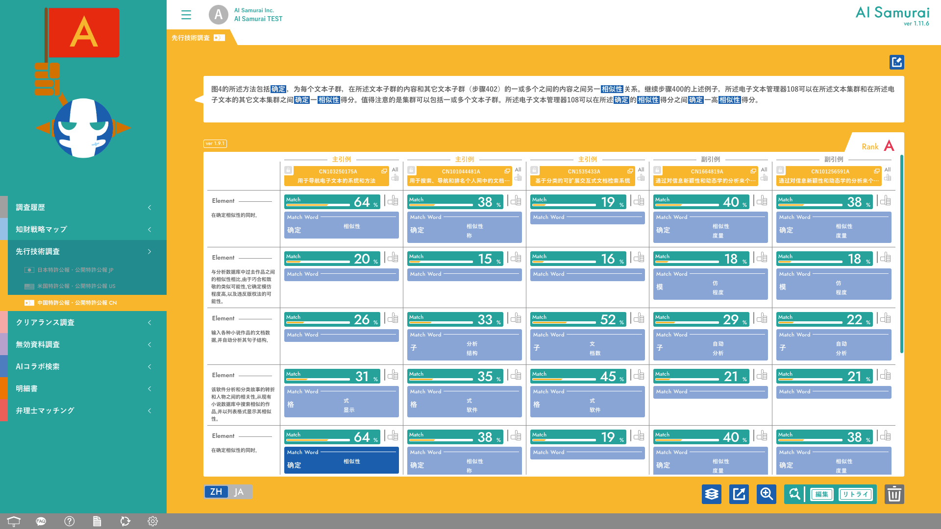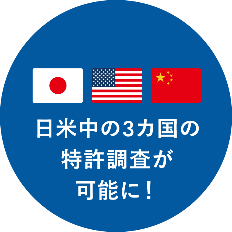これまでの日本・米国に加えて中国特許の調査も可能になりました。直感的なインターフェースで、複雑な日本・米国・中国の3カ国の特許調査を短時間かつ高品質に行うことができます。また、中国特許検索でも、構成要件毎に各文献の該当箇所を日本語でも表示可能です。